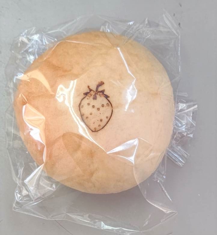 白く焼き上げた米粉パンにかわいいいちごの焼印が目立ちます。 かわいいパンでしょ!